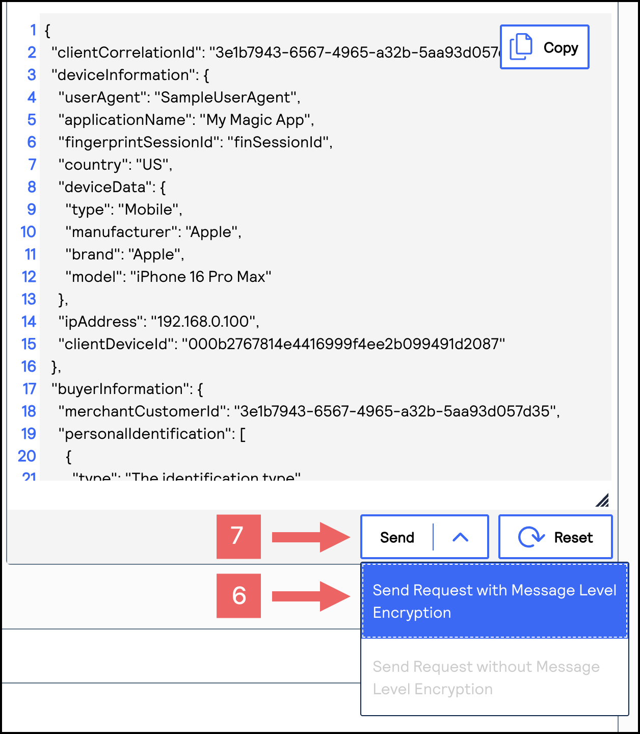 You can send a test API request to validate that your account, API key, JWT messages, and MLE security are working as intended.