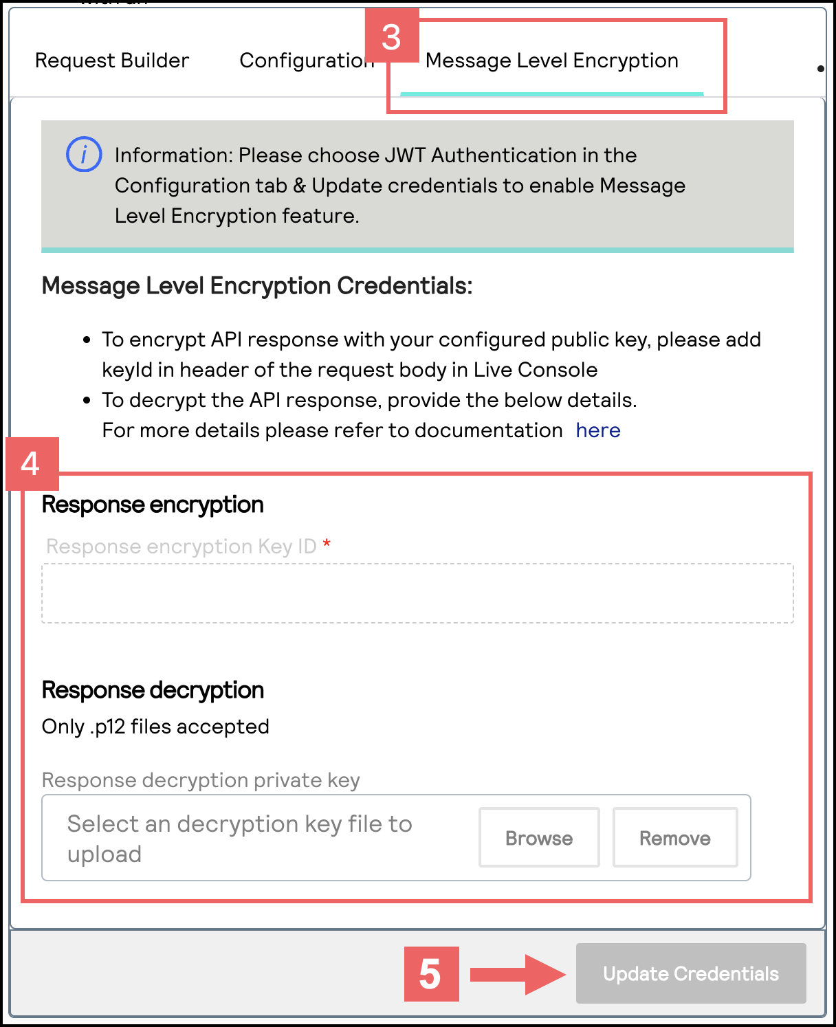 4. In the Message Level Encryption Credentials section, enter your API response MLE key credentials: