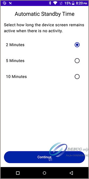 - On the Automatic Standby Time screen, you can choose how long the device screen remains active when there is no activity. Select a standby time, and then tapContinue. If your terminal has an integrated printer, the Load Paper screen appears. See Load Paper in the PAX Terminal with an Integrated Printer. If the terminal does not have a printer, you are prompted to activate your terminal in the Acceptance Devices app. See Activating a Terminal in the Acceptance Devices App.