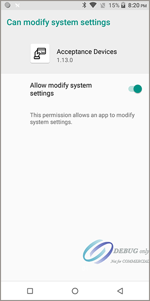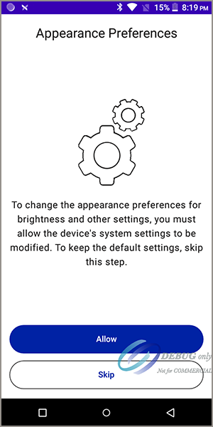 - If you allow changes to the appearance preferences, the Can Modify System Settings screen appears. To enableAllow modify system settings, slide the toggle switch to the right. Tap the back navigation arrow to return to the Adjust Screen Brightness screen.