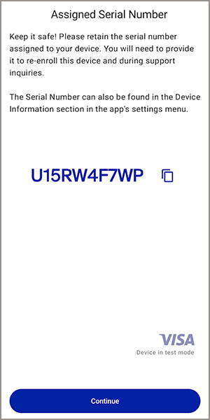 - The Assigned Serial Number screen appears. Record the serial number assigned to your device for future reference. You must provide the serial number when re-enrolling a device or when communicating with customer support. TapContinue.
